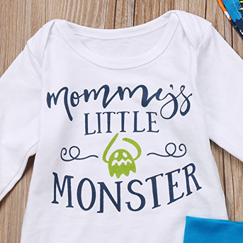 新生児 幼児 男の子 パジャマ 英字 ロングロンパース+ プリント柄 長ズボン+ 帽子 三点セット 綿 ボディスーツ (80, ブルー)