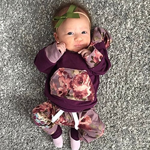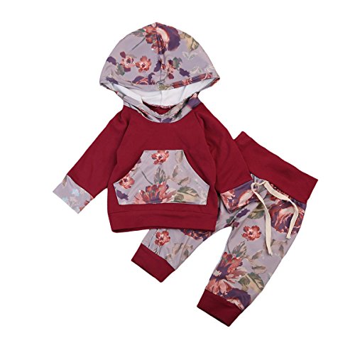 新生児 幼児 長袖パーカー&長ズボン 上下セット フラワー ピンク グリーン ベビー女の子 秋服 スポーティー カジュアル (90, ワイン)