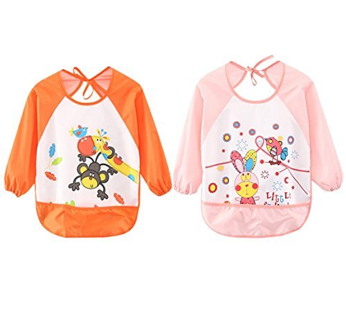- Leyaron Unisex Infant Toddler Baby Waterproof Sleeved Bib, 6 Months-3 Years, Orange Monkey and Pink Rabbit