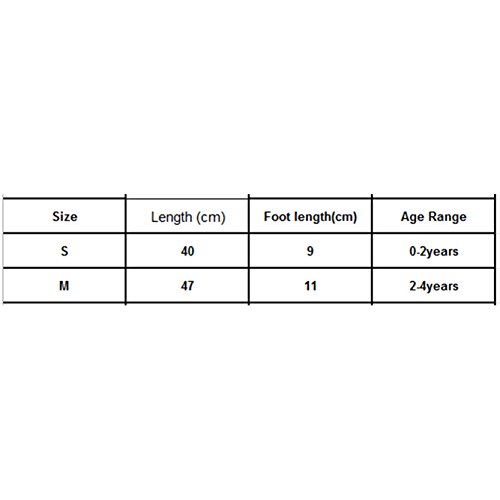 - S(0-2歳)靴下の長さ40cm、靴下の底9m; M(2-4歳)靴下の長さ47cm、靴下の底11cm。