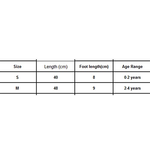 - S(0-3歳)靴下の長さ49cm、靴下の底12cm; M(4-7歳)靴下の長さ54cm、靴底の底14cm;