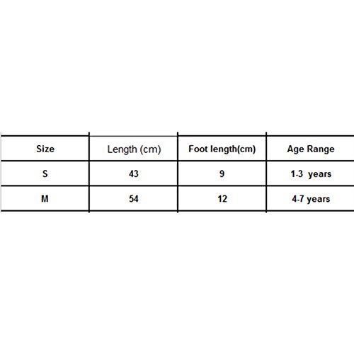 - S(1-3歳)靴下長さ43cm、靴下底部9cm; M(4-7歳)ソックス長さ54cm、靴下底12cm;