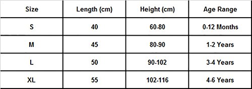 - サイズ0-1歳:40cm;サイズ1-2歳45cm;サイズ3-4歳50cm;サイズ4-6歳55cm;