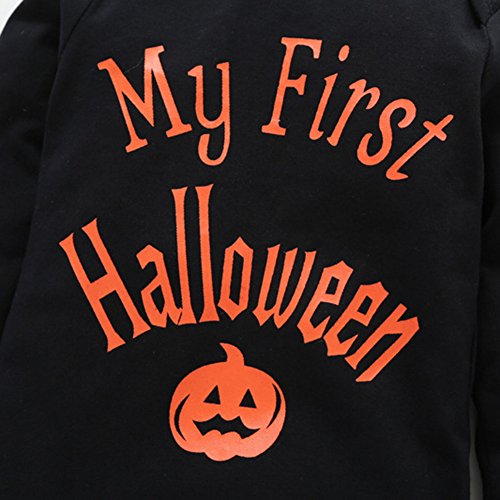 - 'ハロウィン3ピースセット:ラウンドネックロングスリーブ「マイファーストハロウィーン」レタープリントとカボチャ模様のロンパー、カボチャのズボンとマッチする帽子がセットになっています。'