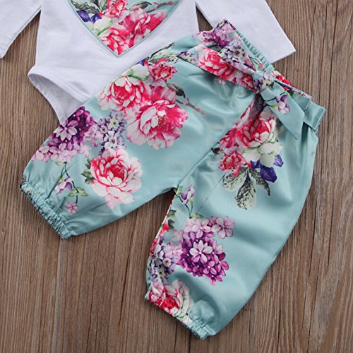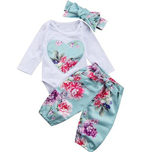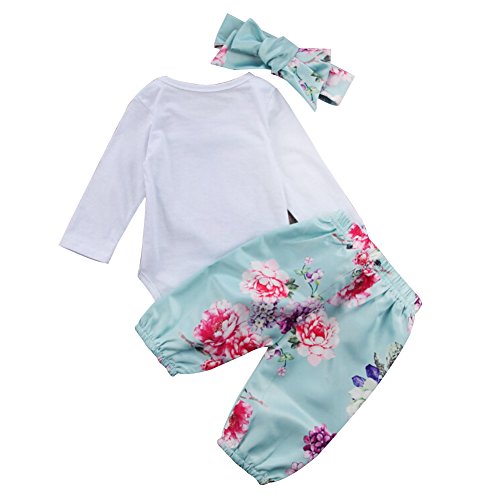 Liebeye ロンパース・カバーオール ロングスリーブラウンドネックトップ +花のパターンのパンツ+ちょう結びのヘッドバンド 幼児新生児 女の子 ライトブルー