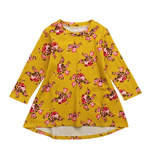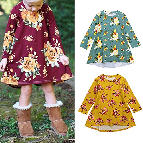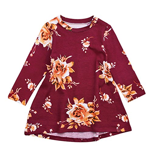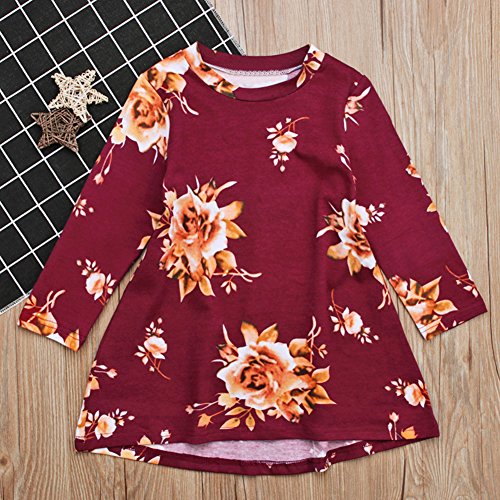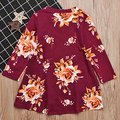 Liebeye 女の子プリンセスドレス ガール ロングスリーブ フラワープリント ファッショナブル かわいい ラウンドカラー ドレス スカート レンガの赤 100