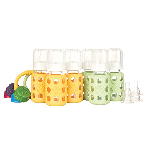- Lifefactory 4-Ounce BPA-Free Glass Baby Bottle and Protective Silicone Sleeve Starter Set, Spring/Yellow with 6 Baby Bottles, 2 Silicone Teethers, 4 Flat Caps and 2 Nipple 2-Packs