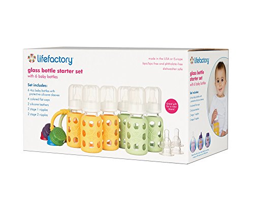 6-bottle feeding starter set with six 4-ounce (120 ml) Lifefactory glass bottles, one Dual Teether 2-Pack, two Nipple 2-packs, and one Flat Cap 4-Cap Set great gift pack for new and expectant moms;Bottles come with Stage 1 (0-3 months) silicone nipples and polypropylene (PP#5) caps, rings, and stoppers;Thermal shock resistant borosilicate glass bottle transitions safely from freezer to boiling water; all components are dishwasher safe; sleeve and bottle can be washed/sterilized together;Bottle grows with baby use with Lifefactory stage 1, 2, 3 and Y-cut nipples, sippy caps and leakproof flat caps ; compatible with most major breast pumps;Healthy alternative to plastic bottle feeding all components are made in the U.S. or Europe and are BPA/BPS-free and phthalate-free