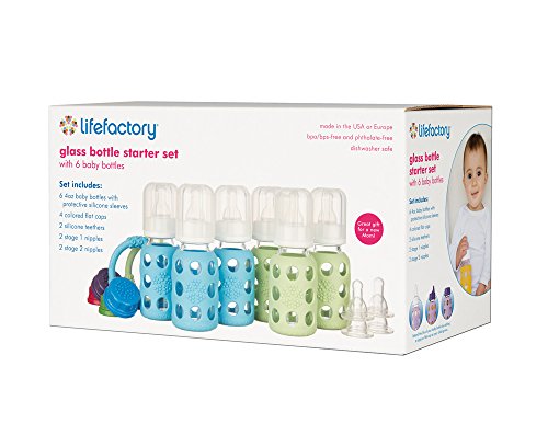 6-bottle feeding starter set with six 4-ounce (120 ml) Lifefactory glass bottles, one Dual Teether 2-Pack, two Nipple 2-packs, and one Flat Cap 4-Cap Set great gift pack for new and expectant moms;Bottles come with Stage 1 (0-3 months) silicone nipples and polypropylene (PP#5) caps, rings, and stoppers;Thermal shock resistant borosilicate glass bottle transitions safely from freezer to boiling water; all components are dishwasher safe; sleeve and bottle can be washed/sterilized together;Bottle grows with baby use with Lifefactory stage 1, 2, 3 and Y-cut nipples, sippy caps and leakproof flat caps ; compatible with most major breast pumps;Healthy alternative to plastic bottle feeding all components are made in the U.S. or Europe and are BPA/BPS-free and phthalate-free