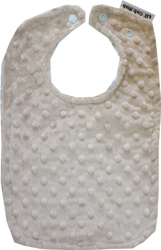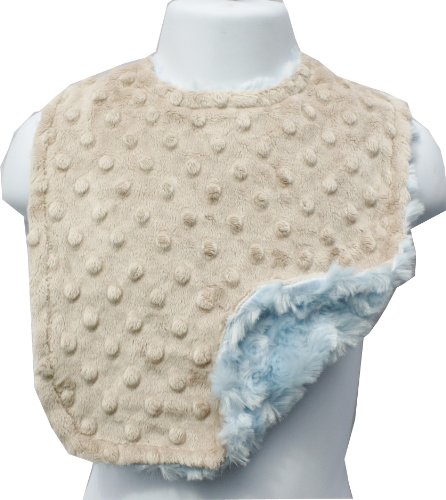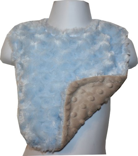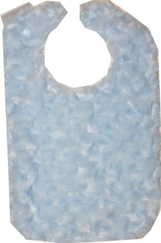 This generously - sized bib is the perfect size to fit babies all the way up to toddlers. It has two snap settings at the neckline for easy adjustability. This bib is made from a mocha dimple dot minky on one side and an exquisite baby blue rosebud swirl on the other side. It is fully reversible and machine washable. This bib is not only functional and versatile, it is a beautiful accessory for any occassion.