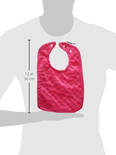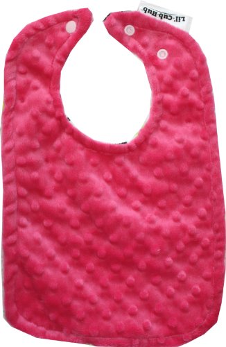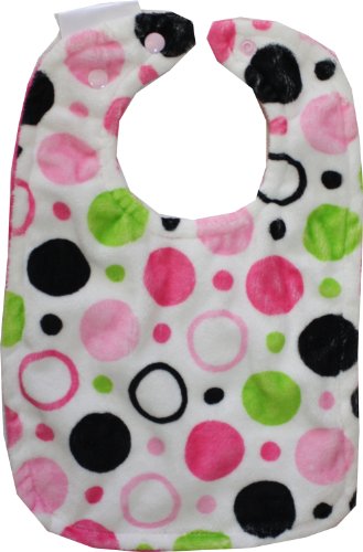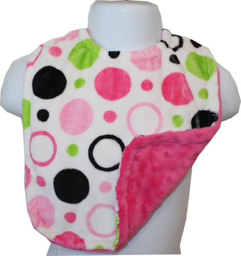 This generously - sized bib is the perfect size to fit babies all the way up to toddlers. It has two snap settings at the neckline for easy adjustability. This bib is made from a funky hot pink, lime green and black circle minky print on one side and a hot pink minky dot on the other side. It is fully reversible and machine washable. This bib is not only functional and versatile, it is a beautiful accessory for any occassion.