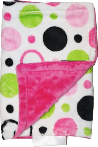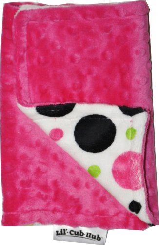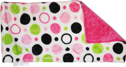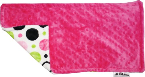 This generously - sized burp cloth is the perfect size for messes and can even be used a security snuggly. It is made from a funky hot pink, lime green, and black circle print minky on one side and a hot pink minky dot on the other side. It is fully reversible and machine washable
