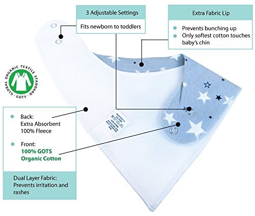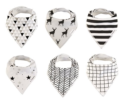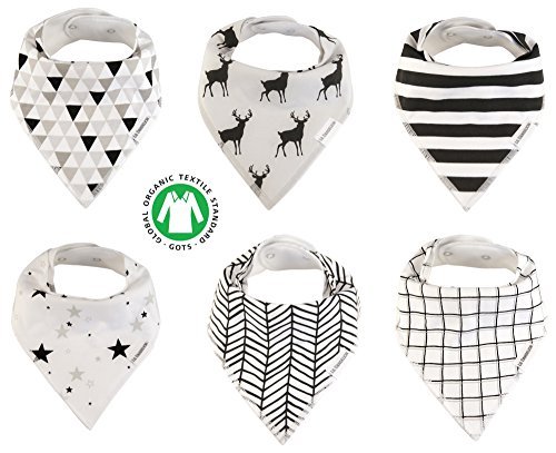 ??CHOOSE ORGANIC FOR YOUR BABY - Bandana bibs are constantly in contact with your baby's skin and mouth so you would want the best & purest quality of fabric. Our bibs are made with 100% GOTS Certified organic cotton that's not treated with toxic chemicals so they are best for babies delicate skin, especially with drool rash eczema.;??BABY STAYS DRY AND LOOKS TRENDY - The extra soft organic cotton in front along with the layered soft plush fleece behind makes our scarf bib super absorbent - our drool bib will shield your baby away from all the dribble and spit ups. Stop changing your babies more than you need to and save time and effort on endless laundry. Besides pacifier, teether toy, teething necklace, this is a must for a teething baby.;??GREAT BABY GIFT SET - This is the perfect gift or present for baby showers, birthdays, holidays or just any occasions for new moms or mom to be. (Black White Grey Deer Star Stripe) Lil Dandelion also donates a portion of all proceeds to Rescue Freedom - an organization that empower the rescue and restoration of women and children suffering in sexual slavery.;??ADJUSTABLE NICKLE FREE SNAPS ADAPTS TO GROWING KID - Instead of Velcro that irritates baby's delicate skin and ruins clothes in dryer, we use two adjustable nickel free buttons that adjust whether they are newborns or toddlers! The snaps make it hard for kids to pull off but easy for parents to snap on or off. Our designer handkerchief bib are designed with a heart shape cut unlike triangle bibs so it lays flat on the chest without bunching up. Recommended ages: 3 months - 3 years;??MONEY BACK GUARANTEE - Lil Dandelion design premium organic baby accessories. We use high quality organic material and believe in our products. Backed with 100% Money Back Guarantee - so if you are unsatisfied, let us know and we will refund your money. Give it a shot and add it to your cart now!