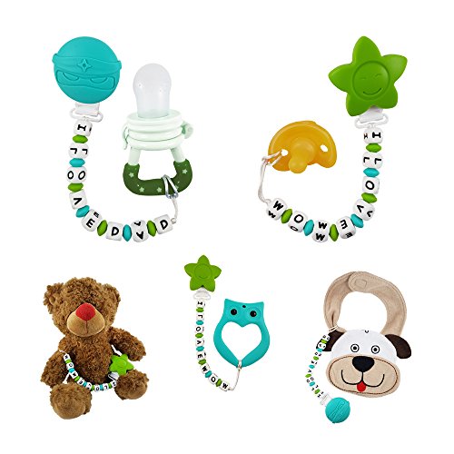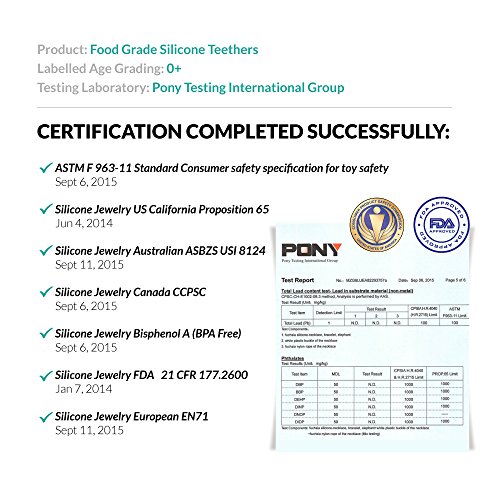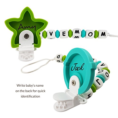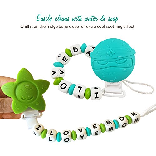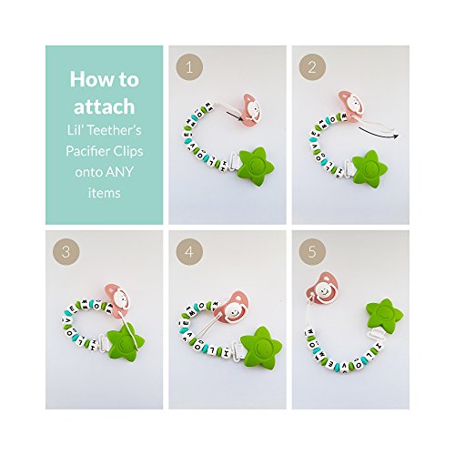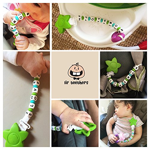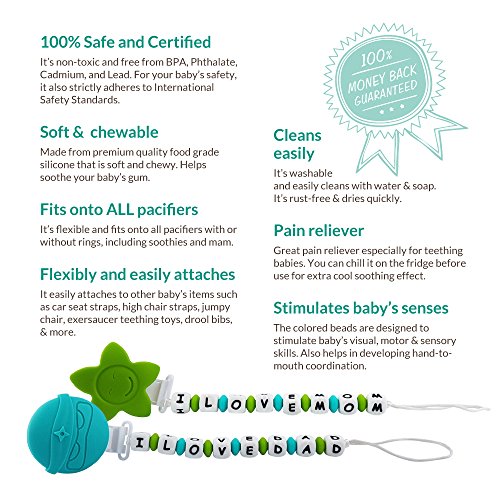 I Love Mom pacifier clip/ teether - Big, soft and chewy beads are made from food grade silicone. The bright colors and shapes are designed to stimulate baby's motor, visual and sensory skills. Easy to be grabbed and handled by little hands, and it enhances baby's hand-to-mouth coordination. With lots of room to chew, it is effective at massaging baby's painful teething gums-put in the refrigerator for added relief.;Lil Teethers are practical teethers that also offers the ability to attach easily to teething rings and toys, car seat straps, high chair straps, baby blankets, drool bibs, pacifiers, etc. The clips open and close easily-no sharp clamps that can pinch baby's fingers, and it comes off with a firm tug to prevent damage to baby's clothes. Clean easily with water and soap, or put in the top rack of the dishwasher.;Lil Teethers are hand-made, and offers excellent gum stimulation and the development of heathy teeth. It has been passed by the FDA, CPSC, California Prop 65, as well as Canadian, Australian and European authorities as a safe, food grade silicone teether/ pacifier clip for baby. It is non-toxic, BPA Free, no phthalates, cadmium, lead or metals.;Versatile and functional, this is a great gift for teething babies.;Soft, flexible, and non-porous-it is an essential for teething babies. Proudly sold with a Manufacturers - No Questions Asked - Money Back Guarantee. Read the description below for more details.