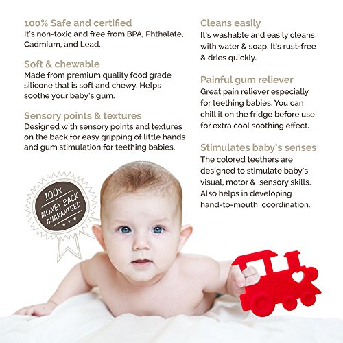 Lil' Teethers Baby Teething Toys. Bendable & Freezer friendly. Highly Recommended by Moms. 100% Silicone (similar to nipples & pacifiers), BPA & Phthalates Free, FDA Compliant. Train