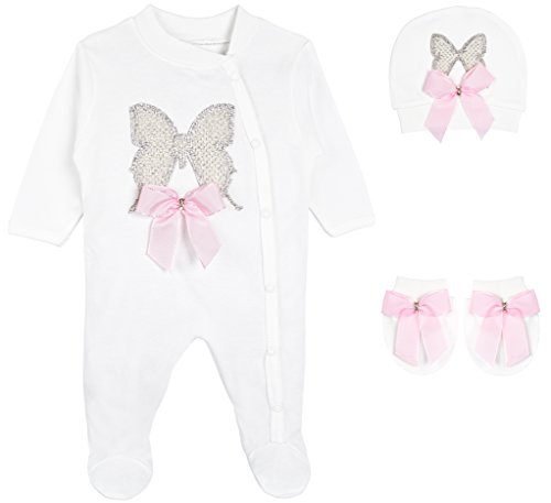 - セット内容は以下の通りです。・バタフライジュエル付き帽子、Footie、ミトン