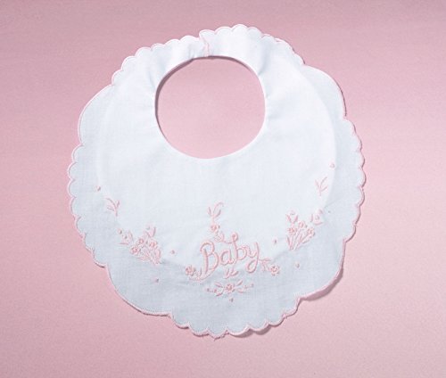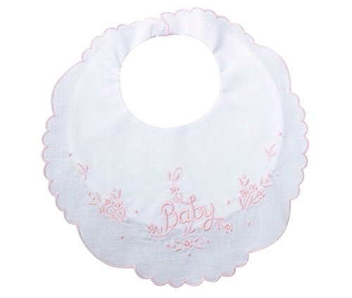 This cotton baby bib measures 8.5" x 9" and is embroidered with the word "Baby" and a series of floral illustrations -- all in pink.