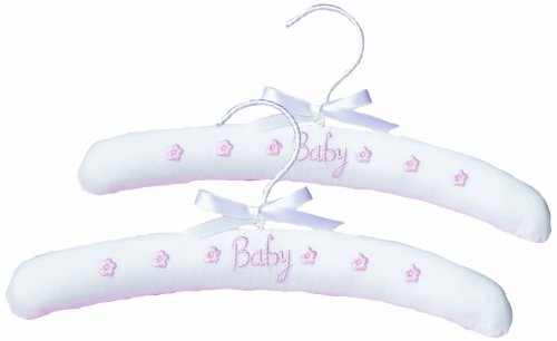 Includes two 12" cotton clothes hangers placed inside a white sheer bag tied shut by pink ribbon. The word "Baby" and a series of flowers are embroidered in pink on one side of the hanger.
