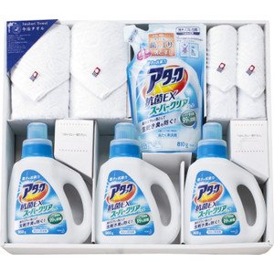【セット内容】●アタック抗菌EXスーパークリアジェル(900g)×3、今治フェイスタオル(34×75cm)・今治ウォッシュタオル(34×35cm)×各2、アタック抗菌EXスーパークリアジェル詰替用(810g)×1