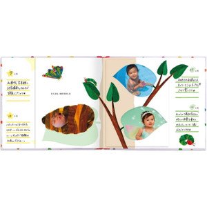 ☆はらぺこあおむしのストーリーに合わせて写真を貼っていくと絵本のようなアルバムが完成します。エコー写真から貼ることができ、写真13枚の成長記録がメッセージとともに残せる仕掛け絵本アルバムです。楽しくメッセージも書けるので、読み聞かせもできます。