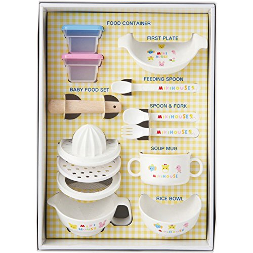 ●スープマグ(φ8.5×5.1cm)・ファーストプレート(12×14.6×3.9cm)・ライスボウル(φ10.3×4.9cm)・すり鉢(φ10.4×5.1cm)・果汁しぼり器(φ10.6×5cm)・スプーン・フォーク・フィーディングスプーン・すり棒・おろし器・こし網×各1、フードコンテナー(6.8×6.8×4.6cm)×2