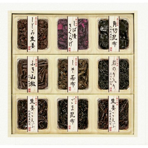 【セット内容】 ●しじみ生姜:30g×1、しば漬きくらげ:45g×1、ふき山椒:27g×1、しそ若布:40g×1、角切昆布:30g×1、岩のり入り:50g×1、ごま昆布:30g×1、生姜こんぶ:35g×2 【アレルゲン】 ●小麦 【生産地・加工地】 ●加工地:日本 【備考】 ●化粧箱入:31cm×31cm×3.5cm/みの 【1梱包最大入数】 ●10個