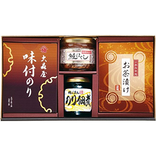 【セット内容】 ●磯じまんのり佃煮(90g)・大森屋味付のり(8切8枚2袋)・京都洙樂庵お茶漬けの素(宇治抹茶味・だししょう油味)(各5.3g×2袋)・オルソン鮭ほぐし(35g)×各1 【賞味期間】 ●常温1年6ヶ月 【アレルゲン】 ●乳/小麦/えび 【備考】 ※商品のデザイン・内容等が変更になる場合がございます。ご了承ください。 ●15.5×27.5×7.5cm/半紙 【1梱包最大入数】 ●18個入