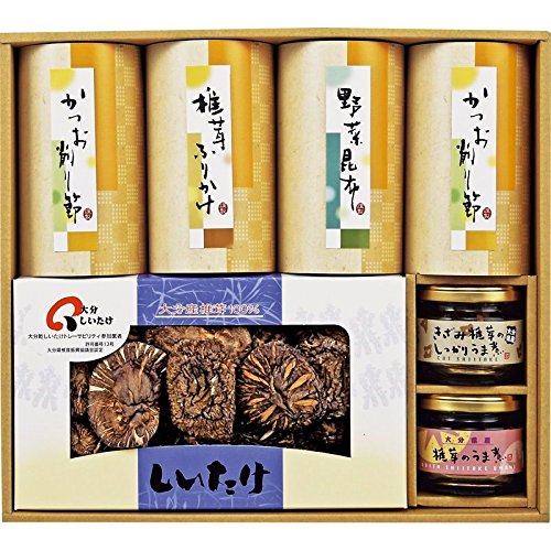 【セット内容】 ●鹿児島県枕崎産かつお削りぶし(3g×3袋)×2、大分産原木乾椎茸こうしん(30g)・大分産原木椎茸うま煮(きざみ)・大分産原木椎茸うま煮(各60g)・椎茸ふりかけ(25g)・北海道産野菜昆布(20g)×各1 【賞味期間】 ●常温1年 【アレルゲン】 ●小麦/えび 【備考】 ●31×34.5×7cm/A3 【1梱包最大入数】 ●10個入