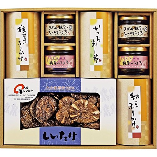 ●大分産原木椎茸うま煮(きざみ)・大分産原木椎茸うま煮(各60g)×各2、大分産原木乾椎茸こうしん・納豆ふりかけ(各30g)・椎茸ふりかけ(25g)・鹿児島県枕崎産かつお削りぶし(3g×3袋)×各1