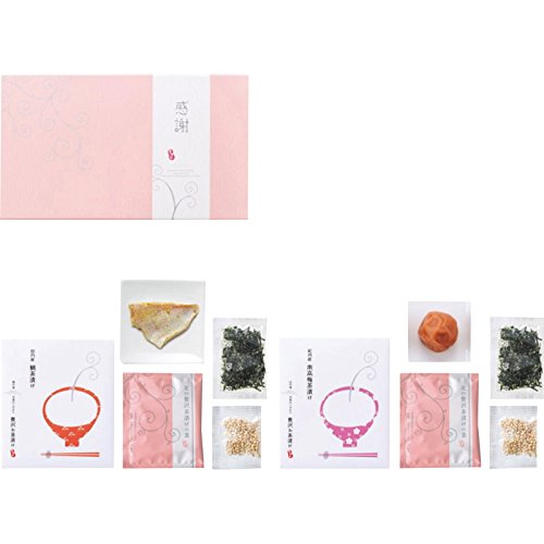 【セット内容】 ●贅沢茶漬けの素(5g)・白いり胡麻・刻み海苔(各0.7g)×各2、小鯛の切り身・紀州南高梅(大玉)×各1 【賞味期間】 ●常温6ヶ月 【アレルゲン】 ●小麦 【備考】 ●15.5×26.7×4cm/半紙 【1梱包最大入数】 ●30個入