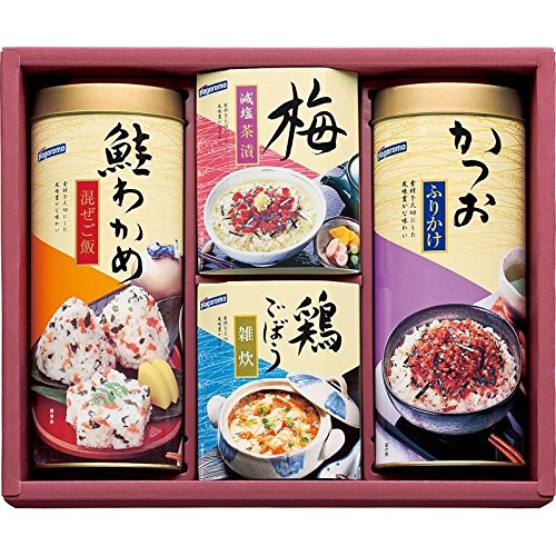 【セット内容】 ●鮭わかめ混ぜごはん(3.2g×8袋)・減塩梅茶漬(6g×5袋)・鶏ごぼう雑炊(7g×5袋)・かつおふりかけ(5g×8袋)×各1 【賞味期間】 ●常温1年6ヶ月 【アレルゲン】 ●乳/小麦 【備考】 ●26×32.5×7.3cm/みの 【1梱包最大入数】 ●6個入