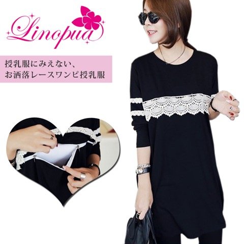【Linopua】マタニティ 授乳服 ウェア 授乳口 大人気 レース 長袖 ワンピース オシャレ授乳服♪ (XL)