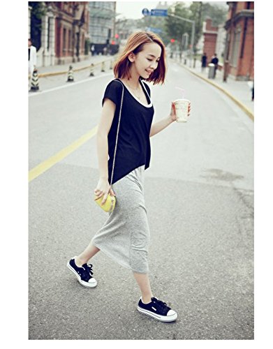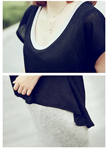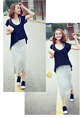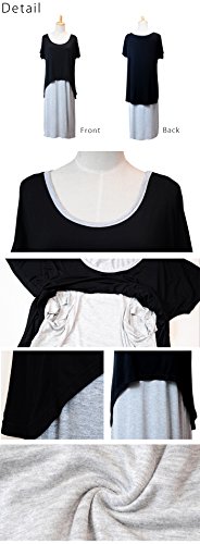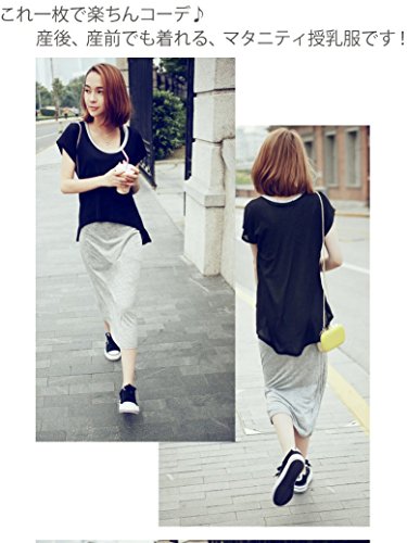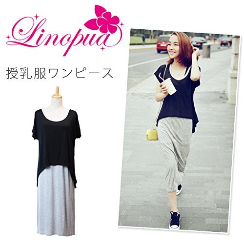 【Linopua】 オシャレ♪ 授乳服 マキシ丈 ロング丈 ワンピース 半袖 グレー×ブラック (M)