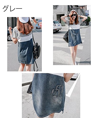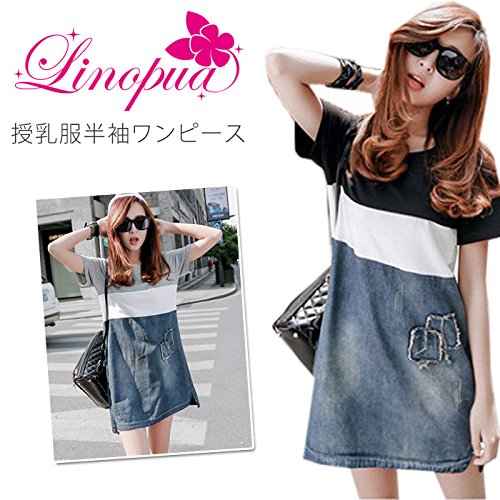 【Linopua】オシャレ♪ 授乳服 ワンピース 春夏にぴったり デニム カラー (半袖L, グレー)
