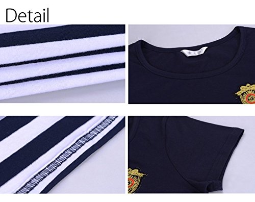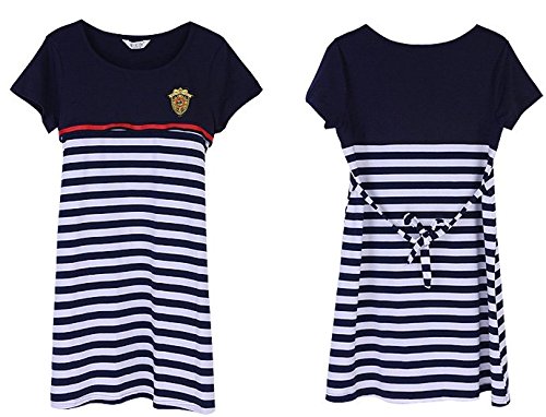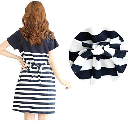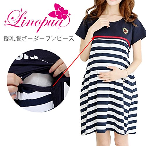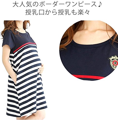 【Linopua】オシャレ♪ 授乳服 ボーダーネイビー ワンピ マリン 春夏にピッタリ♪ 半袖 (M)