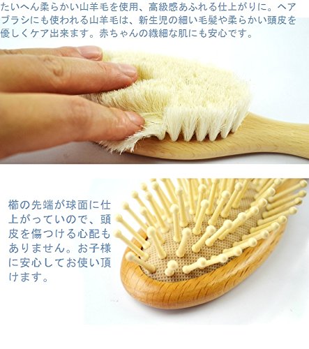 - 1. ブラシの毛はとても柔らかい山羊の毛で作られており、赤ちゃんの繊細な肌にも安心です。ヘアブラシにも使われる山羊毛は、新生児の細い毛髪や柔らかい頭皮を優しくケア出来ます。