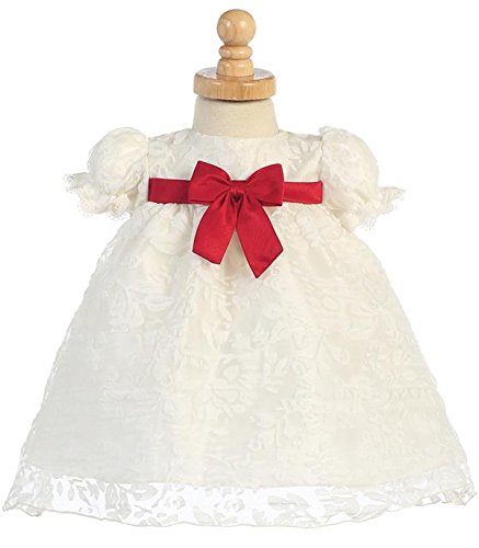 アメリカ老舗のドレスウェアブランドLITOより、美しいレースのドレス。 お色はアイボリー。胸元の切り替えで可愛らしいラインを作ります。真っ赤のリボンは前だけでなく後ろにも付いていて後姿もキュートです。 お袖はかわいいパフスリーブ。背中にパールのボタン。 結婚式やパーティー、退院着としてもお使いいただける素敵なドレスです。 Made in USA (LITOはドレス業界には珍しくアメリカ製であることを誇りとしております)