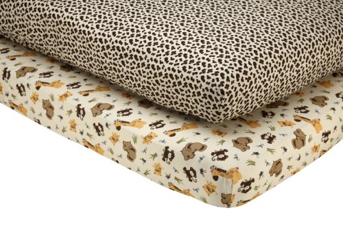 Includes 2 fitted crib sheets - 1 jungle animal mini print and 1 all-over leopard mini print;Fits a standard size toddler/crib mattress 28 x 52; Includes: 2 fitted crib sheets that fit a mattress 28 x 52; Blended fabrics are 55% Cotton / 45% Polyester;Machine wash separately in cold water, gentle cycle; Use only non-chlorine bleach when needed; Tumble dry low heat; Iron on low heat when needed
