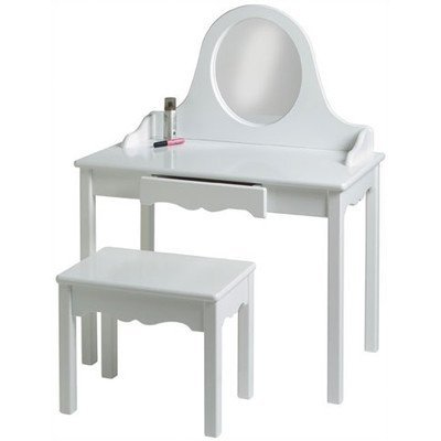 A smaller-proportioned vanity for little girls with big aspirations. The all-wood construction ensures great stability, while the hand-carved edgework show fine attention to detail. Includes a mirror, single drawer and comfy bench. Made of wood. Pictured in White. Ready to assemble. 40 in. H x 30 in. W x 17in. D. Child vanity table: 40 in. H x 30 in. W x 17 in. D. Vanity Top Height: 23 in.. Bench: 17 in. W x 12 in. D x 14 in. H. This Little Colorado Child Vanity and Bench provides a classic luxury for any little girl. When it's time to play dress-up, this elegant child vanity and matching bench is just what your little starlet needs to get ready for her close up. The little Colorado vanity and bench set features a front drawer for storage and an acrylic (shatter proof) mirror for safety and function.