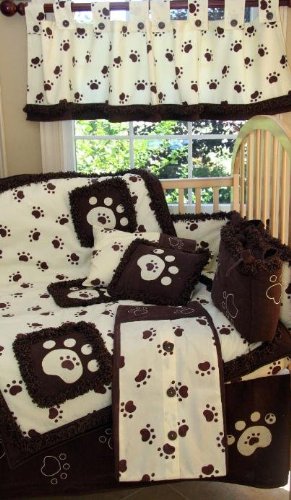 Fluffy... furry... nimble toes... that's what this is all about! Chocolate paw prints on a cream background with chocolate corduroy fabric makes this a warm and cuddly bedding for your baby. Beautiful velvet trim and classy appliques add sophistication to this fun and playful bedding set.