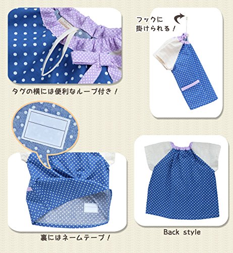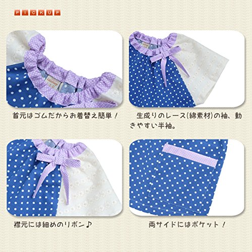 - 前身ごろ・後ろ身ごろは青紺に白の水玉、襟もととポケットの淵には、紫に白の水玉生地。