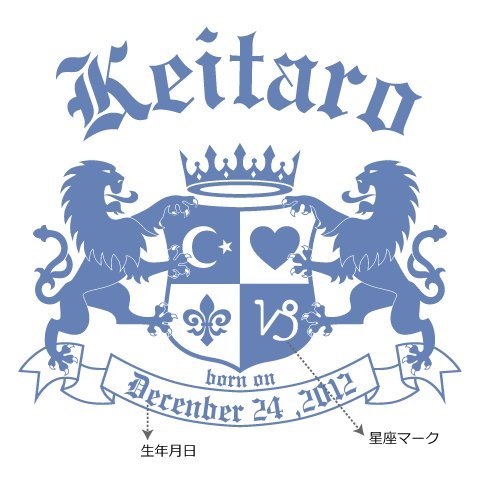 【柄】 ヨーロッパの王家の紋章をイメージしたちょっとノーブルなロゴ柄.お名前,生年月日,星座サインをお入れします