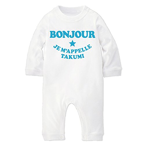 名前入り ボンジュール/BONJOUR 長袖 ロンパース [LR462] 70cm ホワイト×ブルーロゴ 出産祝い 誕生日 プレゼント おしゃれな 名入れ ベビー服