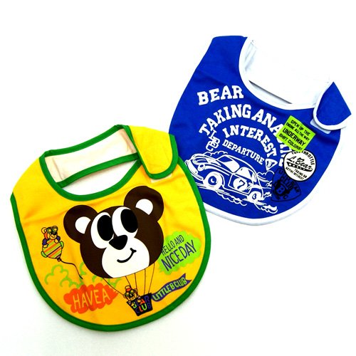 とっても可愛いよだれかけ2枚セット 左肩マジックテープ式 サイズ:幅約20.5cm カラー: オフホワイト×レッド イエロー×ブルー 素材:表地、裏地ともコットン100% 仕入国:日本 生産国 :日本