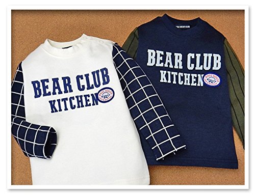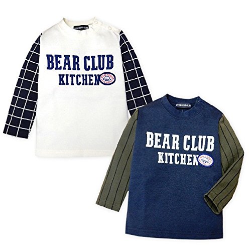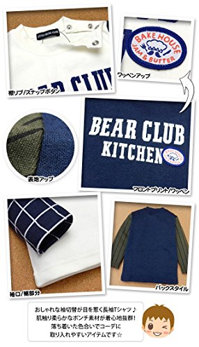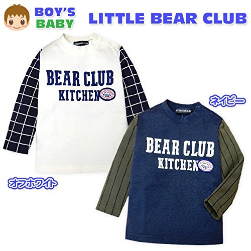(オフホワイト/95cm)ベビー服 男の子 Tシャツ 長袖 LITTLE BEAR CLUB ポンチ素材 チェック ストライプ 袖切替 ワッペン スナップボタン付 男児 ベビ