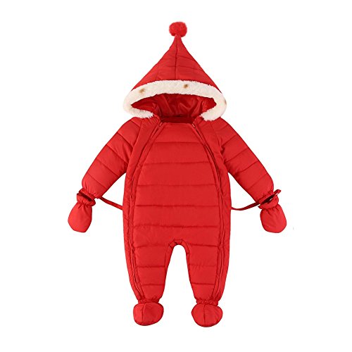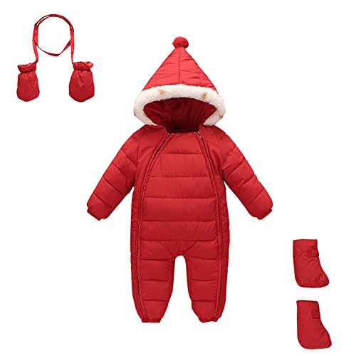 LittleSpring 冬 ダウン カバーオール ロンパース フード付き キャップスーツ ベビー 男の子 女の子 長袖 防寒着 幼児服 厚手 保温 ダウン ジャケット 手袋 靴下 セットアップ ピンク 赤 レッド 90