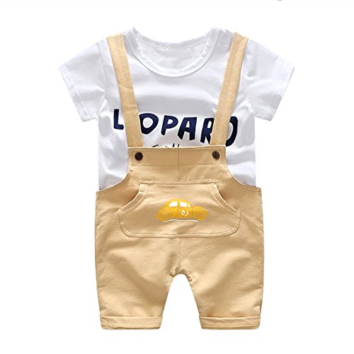 LittleSpring夏 キッズ 男の子 半袖 セットアップ Tシャツ&サロペット 英字プリント 車柄 ベージュ90