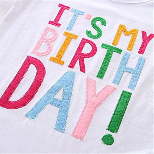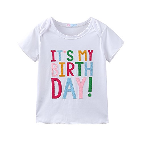 - 清楚なTシャツに「It's my birthday」という英字のアップリケが施されています。