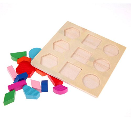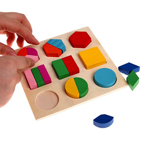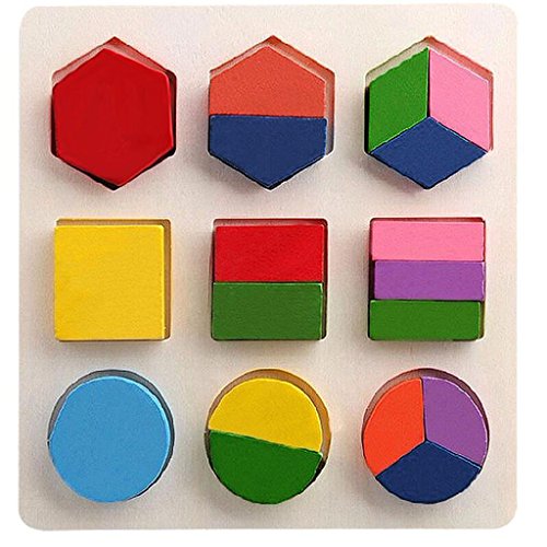 - これは、若い子供たちが分数、色や形状認識の概念を学ぶことのための木製の形状のパズルです。