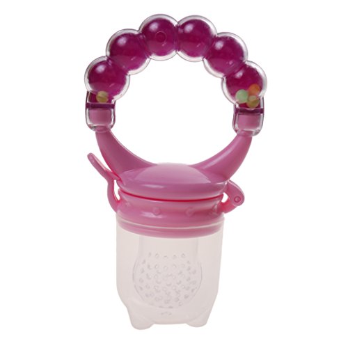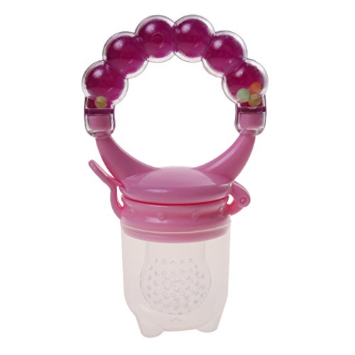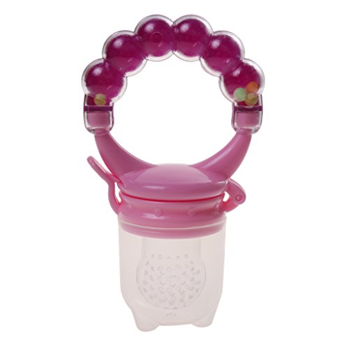 赤ちゃんが食べ物を楽しむためにシリコーンストレーナネットを吸うためにハンドルを保持します。